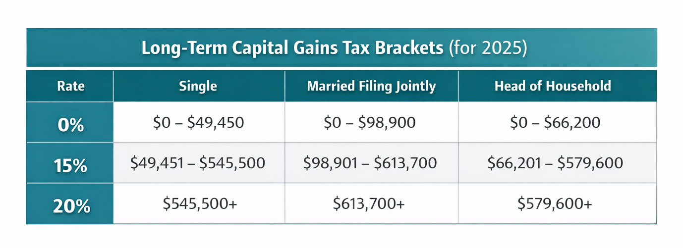 For a breakdown of 2025 long-term capital gains tax rates, see the table above.