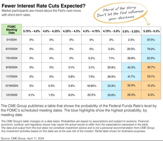 Confused? You’re not alone. So are the financial markets. As you can see in the table above, market speculators now anticipate only one, maybe two, cuts this year. But as the percentages show, there's not much conviction in any outlook.
