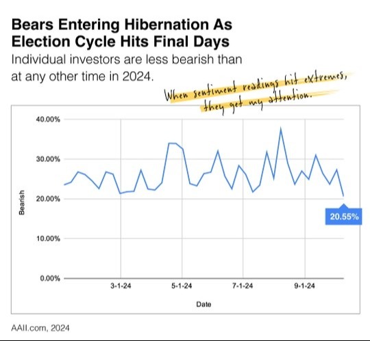 To be fair, bearish sentiment has bounced between 22 percent and 32 percent for most of 2024. But when this type of sentiment indicator reaches an extreme, that’s when I take notice–especially during an election year.